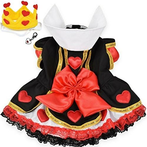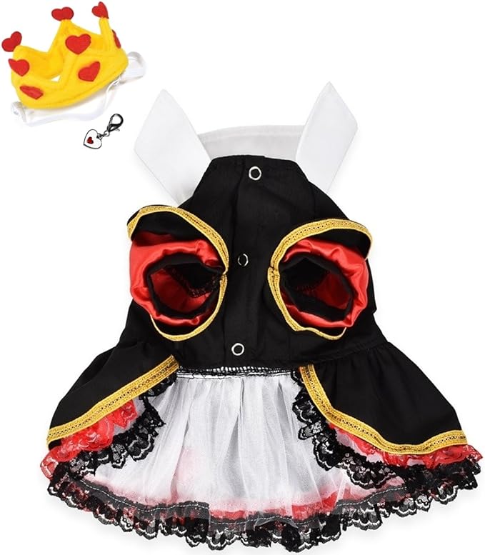 Let your pup rule the kingdom this season with our stunning Royal Queen of Hearts costume set for dogs! This two-piece outfit includes a detailed black overdress with double red-and-black lace-trimmed tiered petticoats, satin inset cap sleeves, and elegant gold trim throughout. Satin appliqué heart accents and a bold red bow complete the regal look. Designed with a convenient snap-front closure, it’s easy to put on and comfortable for your pet to wear.