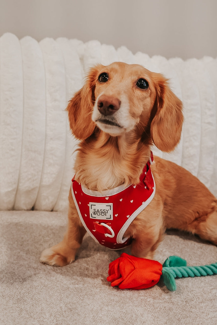 Get your paws on this stunning Valentine’s Day dog harness, designed to turn heads all season long. Featuring a rich velvet red base with delicate white heart details, this love-themed design is finished with eye-popping white hardware for a look that’s equal parts romantic and modern.